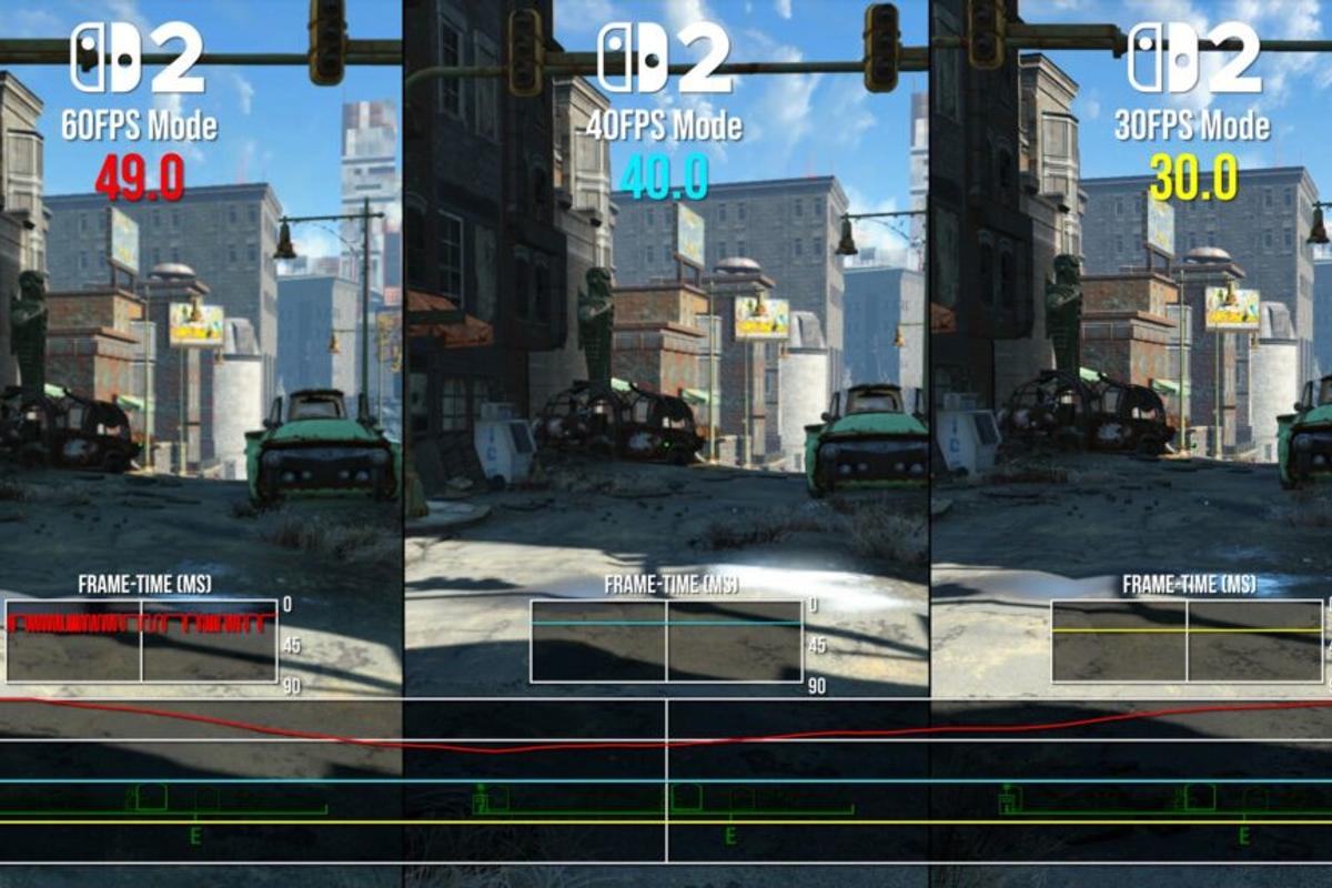 În modul portabil, Switch 2 suportă VRR pe ecranul integrat. Astfel, opțiunea 60fps devine mai viabilă. De exemplu, privind peste acoperișurile Corvega, se observă o schimbare vizibilă între 40-60fps, însă VRR ajută la netezirea fluctuațiilor.