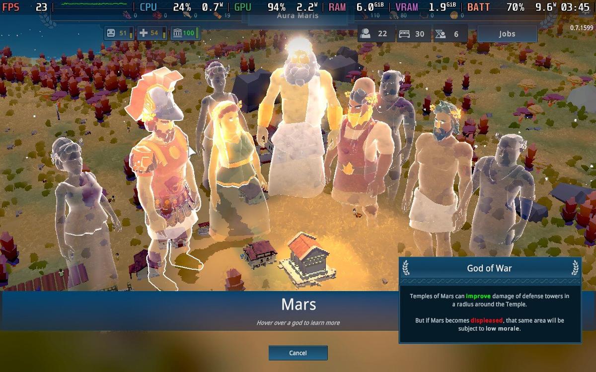 De asemenea, îmi place modul în care sunt deblocate punctele de cercetare, ceea ce ne aduce la modul în care Nova Roma se diferențiază de alte jocuri din gen. În timp ce îți dezvolți orașul, trebuie să construiești temple pentru zei, alegând o divinitate căreia să îi faci pe plac. Există cinci divinități disponibile la lansare, urmând ca altele să apară ulterior, iar fiecare vine cu avantajele și dezavantajele sale. Un templu este legat de o singură divinitate, deși poți avea mai multe temple pentru același zeu și invers, ceea ce oferă multă libertate.