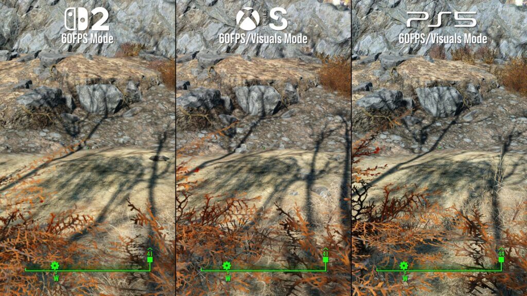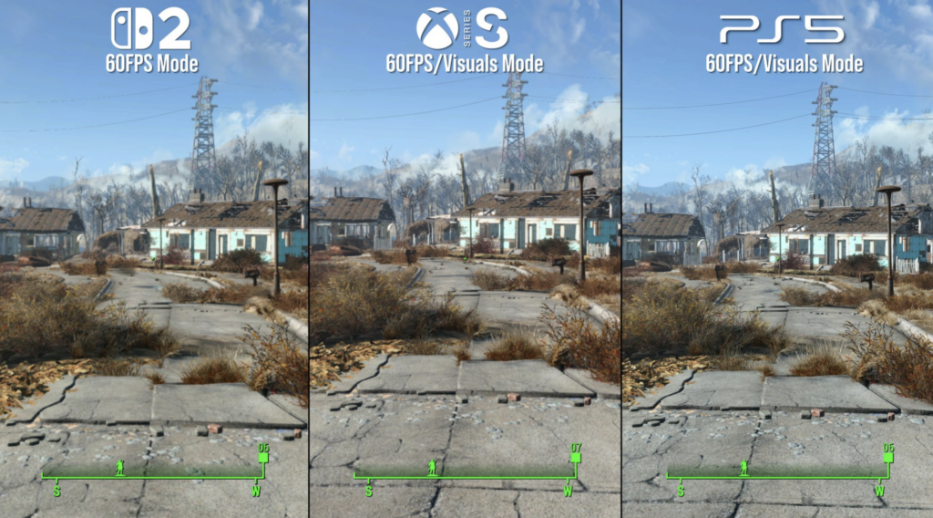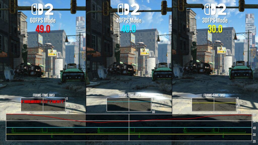În modul portabil, Switch 2 suportă VRR pe ecranul integrat. Astfel, opțiunea 60fps devine mai viabilă. De exemplu, privind peste acoperișurile Corvega, se observă o schimbare vizibilă între 40-60fps, însă VRR ajută la netezirea fluctuațiilor.