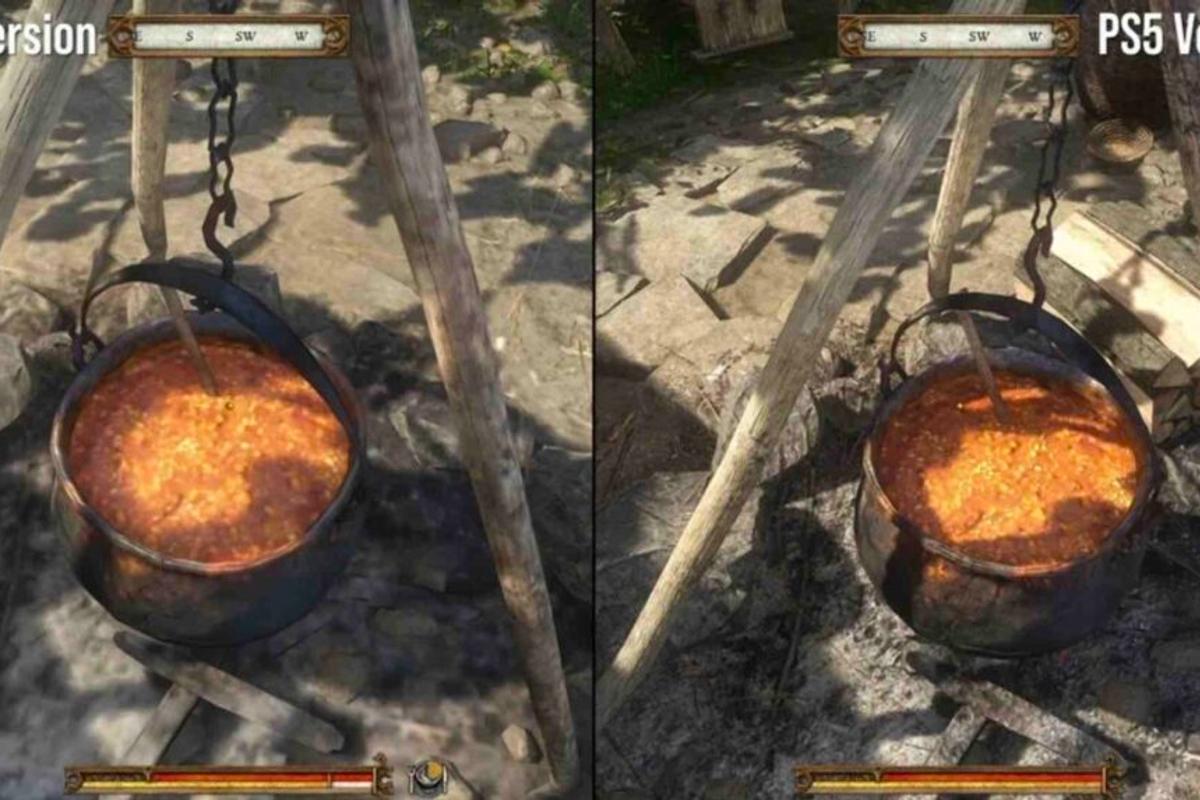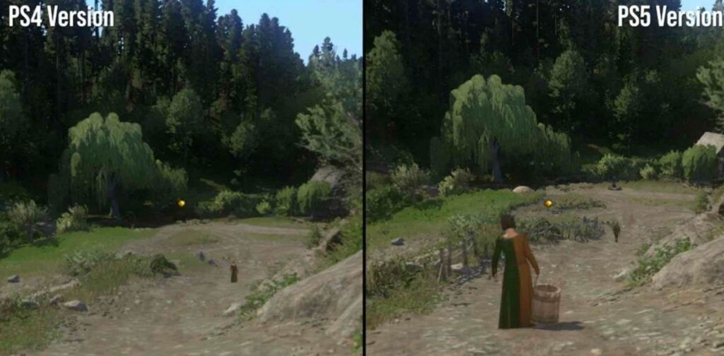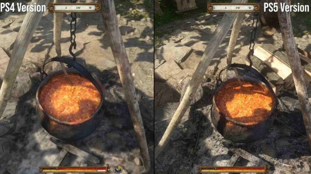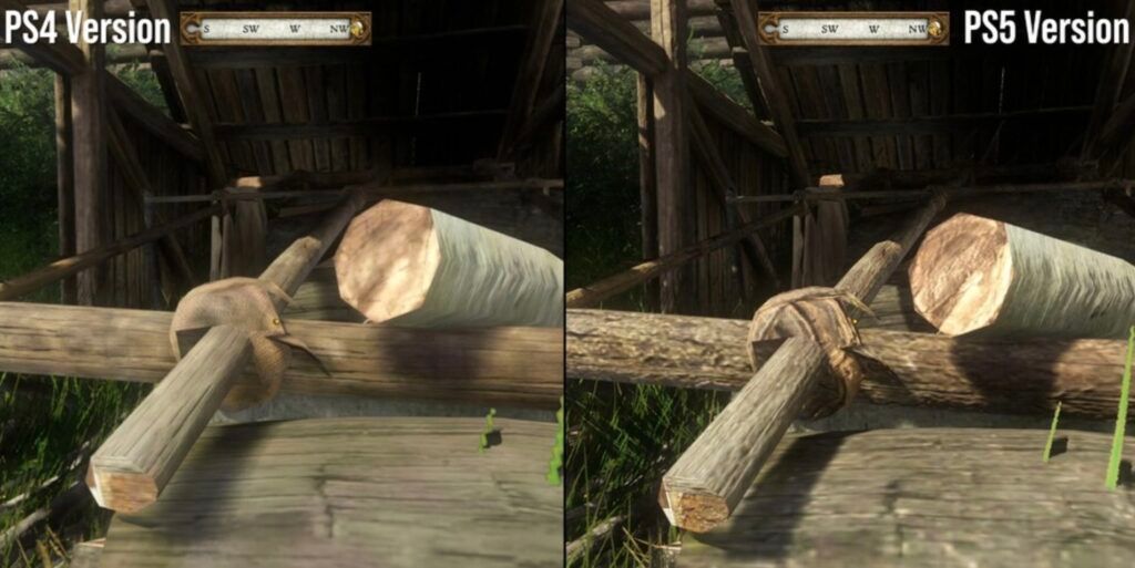 Este un upgrade clar superior, însă partea mai puțin plăcută este utilizarea scalerului spațial AMD FSR1 pentru imaginea finală, combinat cu un filtru de sharpening – probabil CAS (contrast adaptive sharpening). Acest lucru este oarecum dezamăgitor, deoarece poate accentua pâlpâirea agresivă a vegetației, mai ales în scenele îndepărtate. În rest, veștile sunt în mare parte pozitive pentru jucătorii de PS5 și Series X. Pachetul de texturi high-definition este recomandat, îmbunătățind semnificativ calitatea materialelor precum piatra, lemnul, noroiul și textilele. Este un salt major față de grafica neclară a versiunilor last-gen, care erau limitate de doar 5GB de memorie utilizabilă. Din păcate, această opțiune lipsește pe Xbox Series S, în ciuda faptului că are mai mult RAM decât PS4 și Xbox One.