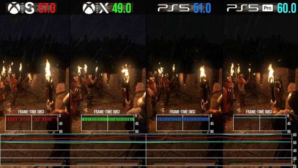 Performanța este interesantă: jocul țintește exclusiv 60fps, fără un mod alternativ de 30fps pentru calitate. Din păcate, niciuna dintre consolele actuale nu reușește să mențină constant 60fps, deși PS5 Pro se apropie cel mai mult. Pe PS5 standard, 60fps este atins în interior și în multe zone open-world, însă mișcările rapide ale camerei afectează temporar rezoluția dinamică, iar în zonele aglomerate cu NPC-uri, precum Talmberg Barracks sau orașul Rattay, framerate-ul poate scădea în zona 40fps, probabil din cauza limitelor procesorului Zen 2.