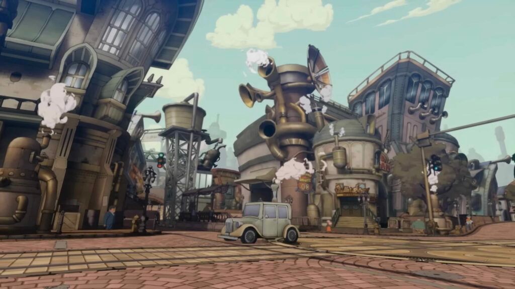 Anunțul a venit la pachet cu un trailer proaspăt, prezentat la Tokyo Game Show, care introduce muzică nouă compusă special pentru această aventură și oferă primul tur vizual al orașului „Steam Bison”, plus dialogul clasic Layton & Luke. Detaliile au fost evidențiate inclusiv pe canalele oficiale.